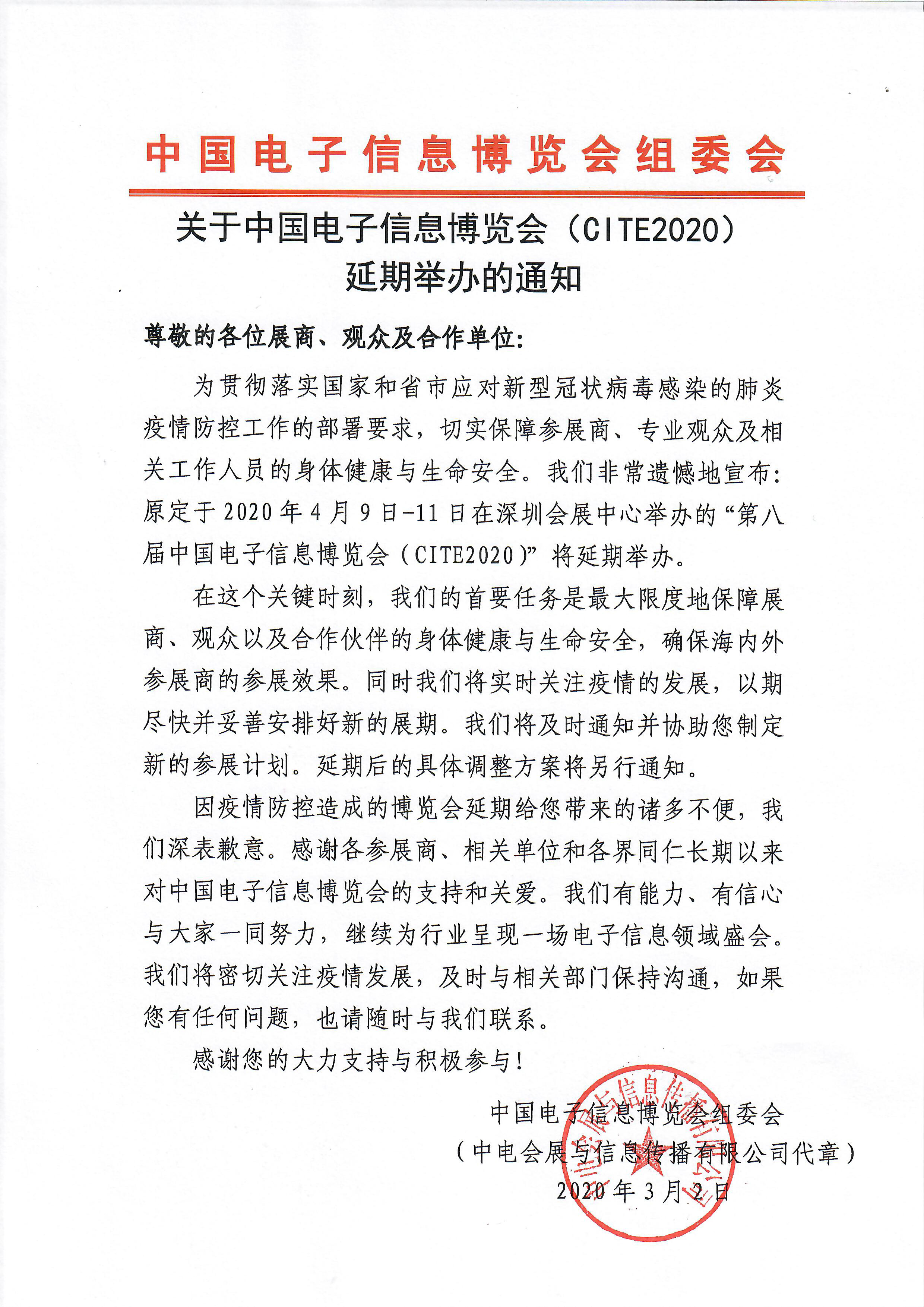 為貫徹落實國家和省市應對新型冠狀病毒感染的肺炎疫情防控工作的部署要求,切實保障參展商、專業觀眾及相關工作人員的身體健康與生命安全。我們非常遺憾地宣布:原定于2020年4月9日-11日在深圳會展中心舉辦的“第八屆中國電子信息博覽會(CITE2020)”“第95屆中國(深圳)電子展”將延期舉辦。